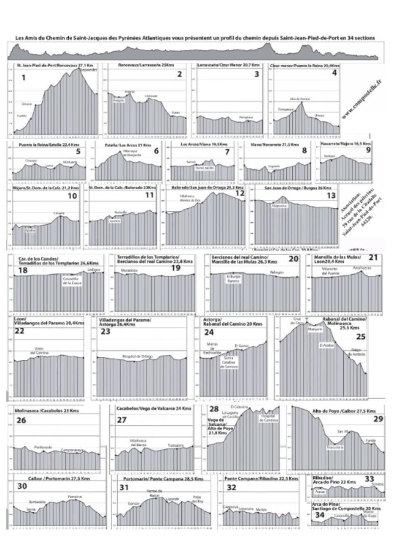 순례길을 처음 시작할 때에는 생장 사무실에서 고도표와 알베르게 정보가 담긴 종이를 받는다. 특히 고도표에는 보편적인 사람들이 하루 걷는 거리를 계산해 34일 일정으로 나뉘어 소개하고 있다. 한마디로 산티아고 순례길에 대한 정확한 안내문인 것이다.