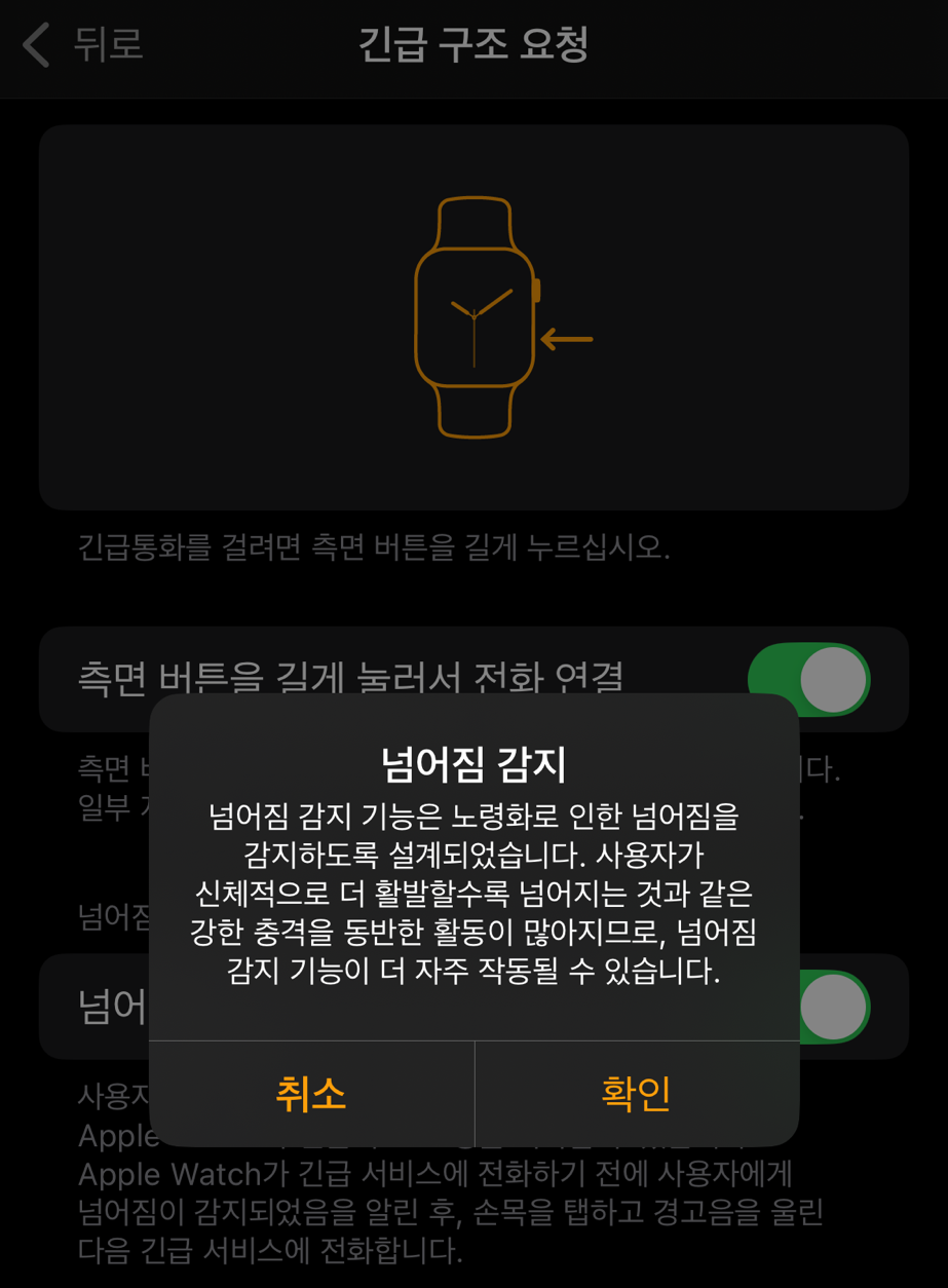 글을 쓰면서 혹시나 해서 스마트 워치 설정 앱을 켜봤는데. [넘어짐 감지 기능 : 끔 (OFF)]