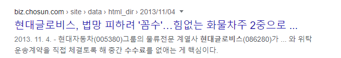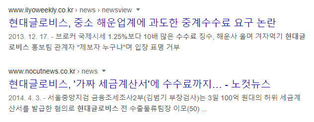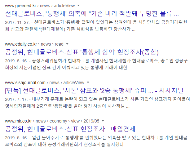 포털사이트 다음에서 '현대글로비스 갑질'이라고 검색을 해보면, 사돈 삼표와 '2중 통행세' 슈퍼 갑질을 비롯해 정말 듣도 보도 못한 기상천외한 갑질이 수두룩합니다.