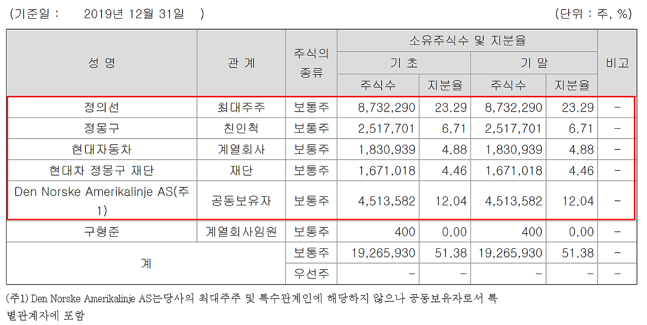 정의선 23.29%, 정몽구 6.71%, 현대차 정몽구 재단 4.46%, 현대자동차 4.88%, 노르스케 아메리카린제 에이에스 12.94% 등이 주요 주주입니다.