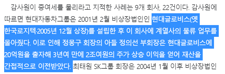 감사원이 2013년 공개한 재벌들의 일감몰아주기와 편법 자산증여 실태에 따르면 정의선 부회장은 현대글로비스에 최초로 출자한 금액이 20억원 수준입니다.