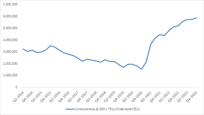 2023년 4분기 기준으로 8천TEU 이상의 컨테이너 선박 오더북(수주 잔량)은 약 58만TEU로, 이는 2014년 이후 최고 수준입니다. 따라서 향후 인도될 컨테이너 선박이 많다는 것을 알 수 있죠.