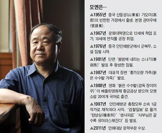모옌이 2012년 노벨문학상을 수상한 후 펴낸 자전적 에세이입니다. 모든 것이 변화한다는 말처럼, 군대에서 운전병이라도 하면 좋겠다고 소망하던 청년은 30년이 지나 중국을 대표하는 작가가 되었습니다. 변방에서 중심으로, 조연에서 주연으로 변신한 모옌의 삶이, 마치 중국 역사와 닮은 듯 합니다. 모옌은 1967년 문학대혁명으로 12세에 학업을 포기하고, 18세에 면직물 공장에 취업을 했지만 2012년에 노벨문학상을 받게 됩니다.