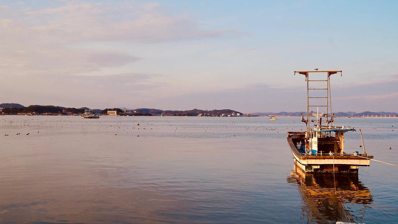 물 위에 배 한 척이 있다.