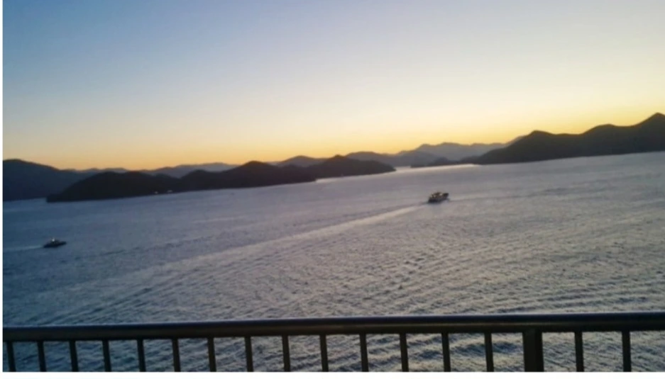 창밖으로 다도해의 드넖은 푸른 바다와 섬들 그리고 간간이 지나가는 배들이 보었는데 좁은 이 방에서는 시내만 보이네.