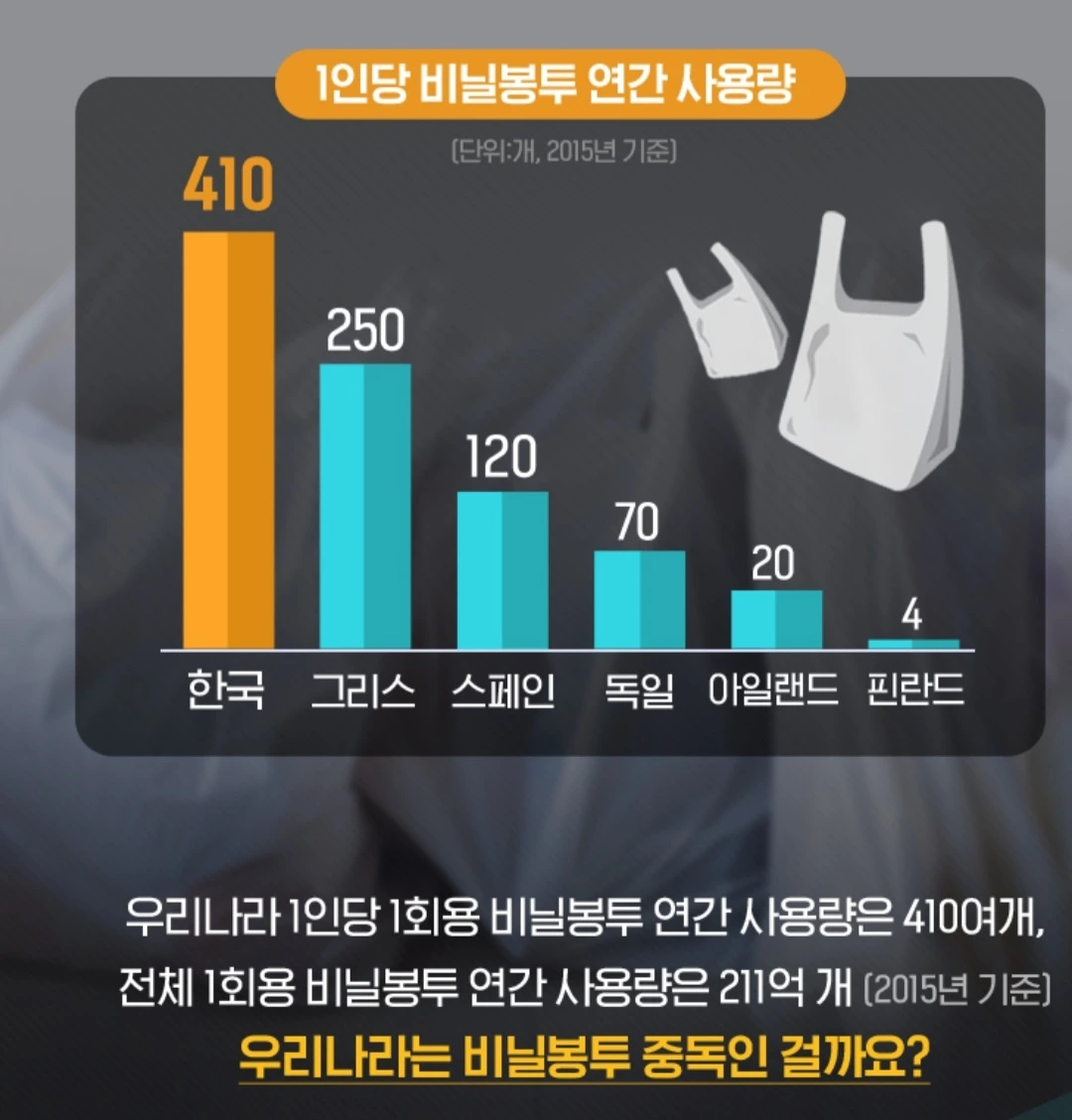 우리나라 연간 일인당 비닐봉지 사용수는 460개다.