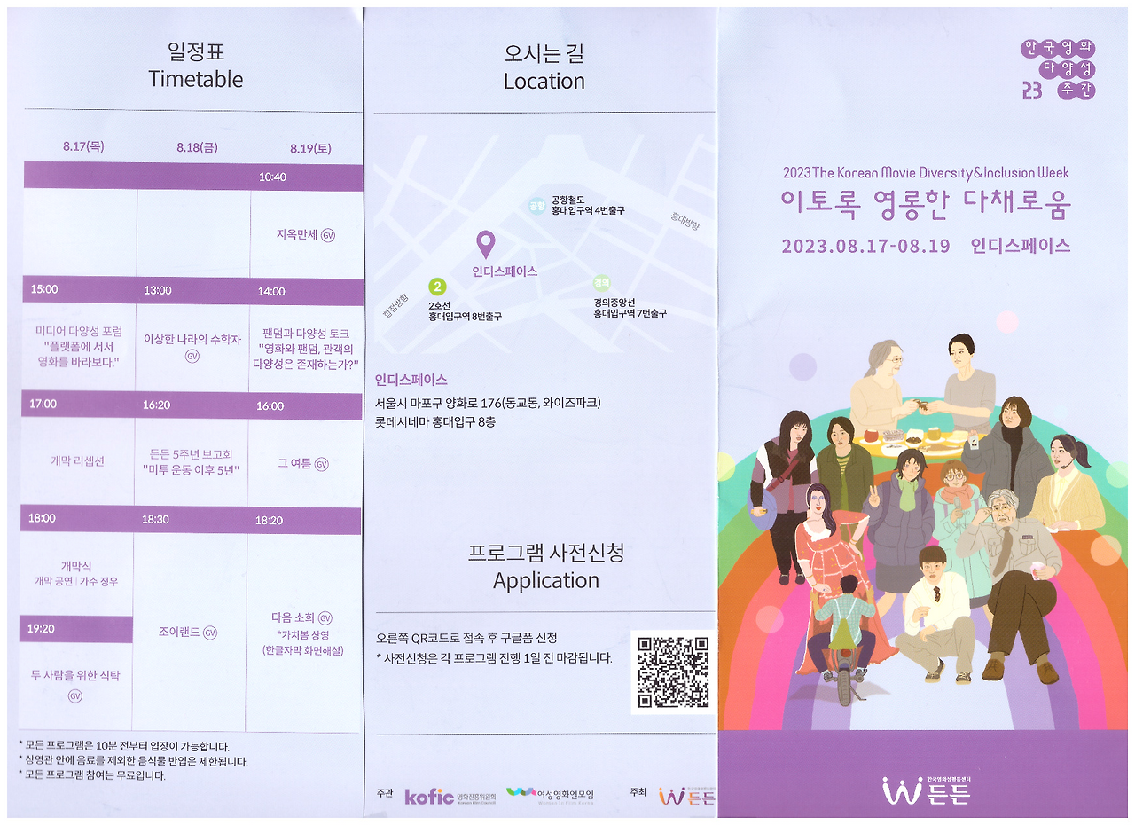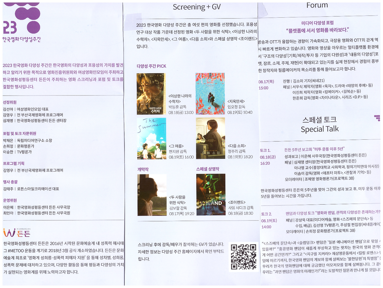 '2023 한국영화 다양성 주간은 한국영화의 다양성과 포용성의 가치를 발견하고 알리기 위한 목적으로 영화진흥위원회와 여성영화인모임이 주최하고 한국영화성평등센터 든든이 주최하는 영화 스크리닝과 포럼 및 토크를 결합한 행사입니다.'(리플릿에서)