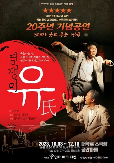 부모의 죽음 앞에서 유산을 두고 언쟁하는 자식들 얘기, 부모 먼저 세상을 뜬 자기 자식 얘기 등. 그런 얘기를 하면서도 자연스럽게 관객의 참여를 유도한다. 90분간의 교향곡 지휘자처럼, 삶과 죽음의 현장을 예술로 승화시키는 일을 한다. 얼마나 아름다운가. 관객은 눈물을 지으려다가는 배우의 연기력과 입담에 웃음을 터뜨린다. 언제 어떻게 극이 전개될지 예측하기 어렵다. 관객은 슬플 준비와 웃을 준비를 동시에 하고 있어야 한다. 아니 준비를 하지 않아도 염쟁이 유씨가 이끄는 대로 따라가기만 하면 된다. 그의 연기력에 감탄이 절로 나온다. 그가 한 말 중에 지금도 귓전에 맴도는 말이 있다.