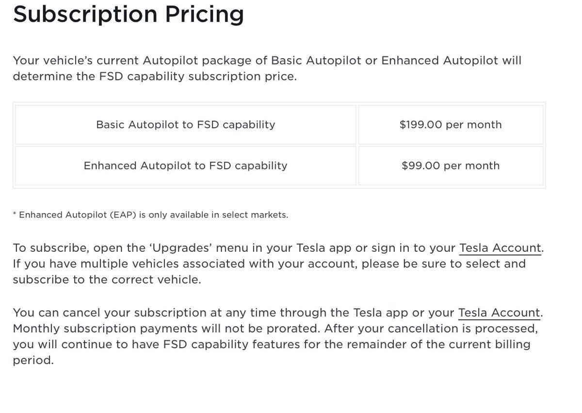 이번에 발표된 FSD 구독 서비스의 비용 정책은 다음과 같습니다.