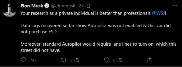 이 부분은 차를 사면 주행 관련 데이터를 테슬라가 가져간다는 부분이 공지되기 때문에 확인이 가능한 것이고, 경찰이 압수 수색하면 바로 보여줄 수 있는 사항이라 딱히 거짓말을 할만한 사항은 아닙니다.
