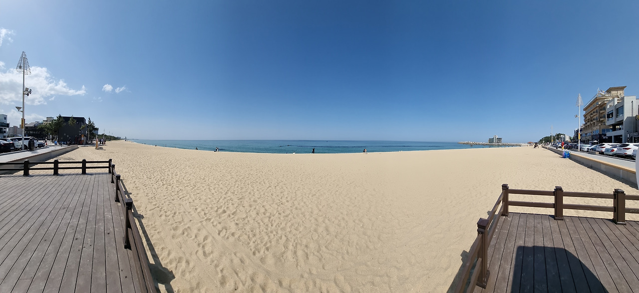 안목해변 파노라마 샷인데 이렇게 나오는군요... 하여간 정말 햇살이 눈부셨습니다.