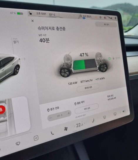 상주 슈차를 들를까 아니면 다음날 신탄진 슈차를 들를까 고민하다가 경부선을 타는 테슬라 오너들의 성지 상주 슈차로 가기로 했습니다. 상주 슈차를 찍고 이동하니 어느 정도 달리다가 약 30여 km 남은 시점부터 프리 컨디셔닝을 시작합니다. 아... 차가 너무 똑똑해...