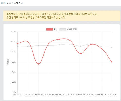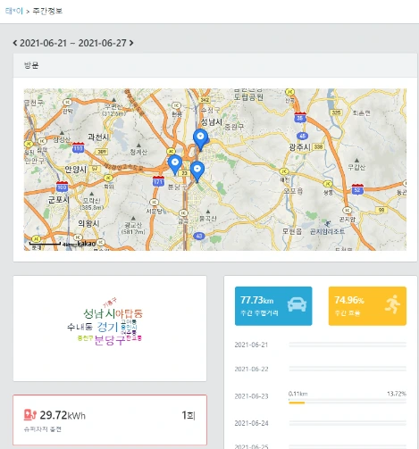 주간 주행 내용 중 최근 5km 이상 주행한 기록을 가지고 주행효율을 보여줍니다. 가용거리는 테슬라 차량에서 보여주는 주행 가능 거리인데 실제 제가 주행한 건 79.65% 수준밖에 되지 않았다고 보여주네요. 고속으로 주행하거나, 막히거나 하는 교통 상황에 따라 주행효율이 떨어지곤 합니다. 다음 한 주 동안 제가 적절한 주행을 하면 다시 효율은 올라가게 되어 있습니다. (이 효율에 너무 스트레스받지 마세요)