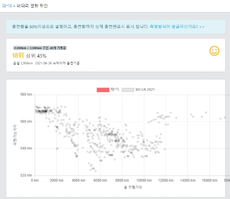 주행 가능 거리의 시작점이 520km부터라는 거 유의하시고요. 테슬라메타를 사용하는 모델3 롱레인지 2001 오너들의 상태를 한눈에 볼 수 있습니다. 제 차의 점은 안 보이네요. 설명에 보면 충전 완료 후 1분 정도 후에 충전 케이블을 뽑으면 수집이 된다는데 아직 그런 적이 한 번도 없어서 그런가 여기에 표시가 없네요.