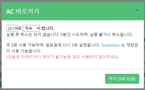 설정하면 5분간 시도하고 차량이 연결 안 되면 취소되며 중간에 테슬라메타를 통한 에어컨 켜기 취소는 되지 않습니다. 그리고 주 3회 사용 가능합니다.