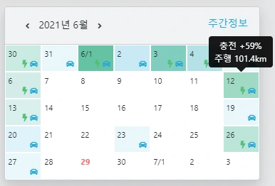 오른쪽에 있는 달력은 한 달 동안 주행한 날짜와 충전한 날짜를 보여줍니다.