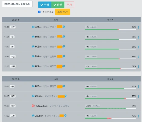 위의 주행, 충전, 주차를 나누어서 볼 수도 있게 되어 있으며 1분 미만이 제외된 것을 풀어 주면 더 디테일하게 나오지만 뭐... 그 정도까지는....