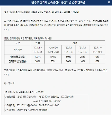 환경부 누리집에 올라온 변경 안내문따라서 2021년 7월 1일부터는 기존에 충전기 당 50% 할인해 주던 기본요금을 25% 할인으로 전력량 요금도 30% 할인에서 10% 할인으로 변경하게 되었습니다.