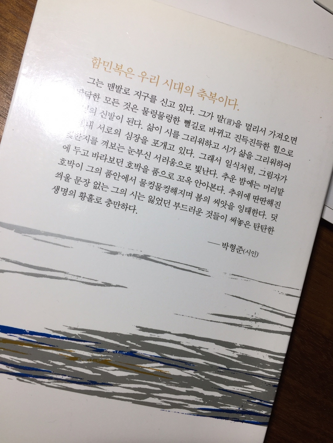 다른 시인의 말처럼 존재 자체가 축복인 함민복 시인은 오래오래 지치지 않았으면 싶다. 이런 희망 자체가 헐값에 감정노동을 하라는 것 같아 좀 그렇지만, 시인의 말대로 '말랑말랑한 힘'은 따뜻하고 강하고 오래간다. 10년 후에 다시 꺼내 보아도 그 힘은 변하지 않을 테니 이 시집은 훗날을 위해 고이 잘 간직하려 한다.