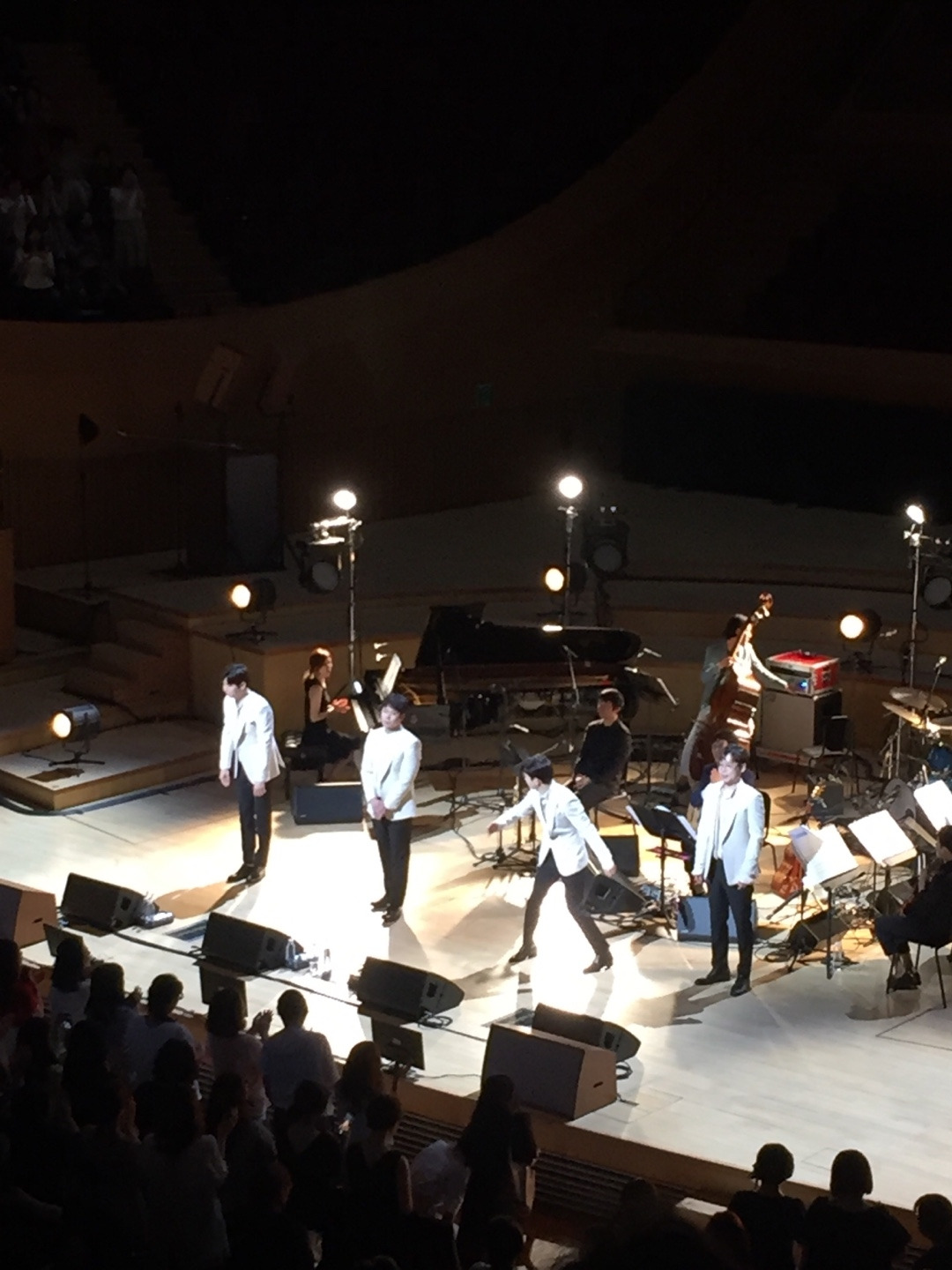그는 지난번과 마찬가지로, 유독 긴장된 모습으로 말을 아꼈다. 각별히 목 관리를 하는 듯싶다. 다른 멤버의 음성도 그렇지만, 현수 군이 쏟아내는 폭포수 같은 소리는 한여름에도 소름이 돋을 정도로 전율이 느껴진다. 개인 마이크를 안 쓰니 그의 생생한 목소리가 더 명징하게 들렸다. 화음을 넣을 때조차, 아니 화음은 화음대로 그의 음성은 부드러우면서도 힘차게 흘러나와 귀에 꽂힌다. 고음으로 솟아오를 때 그가 살짝 접은 팔을 바르르 떨며 노래하는 모습이 무척 인상적이다. 이번 공연은 아니지만, 무대에서 꽤 가까운 자리에 앉았을 때 보면, 그는 노래할 때 객석에 멀리 시선을 주면서 관객들과 눈 마주치는 걸 피하는 것 같다. 쑥스러워 그러는 것 같은데, 막상 그에게 물어보면 전혀 그렇지 않다고 할지도 모르겠다. 가끔 방송 나올 때 보면, 멘트 하다가 귀까지 빨개지기도 한다. 그런 모습은 뭐랄까, 참 순수하고 귀여워 보인다.