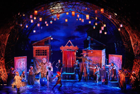 찬란하고 잔인하고 아름다운 공연이었다. 압도적인 무대 장치는 파도에 휩쓸린 난파선과 눈보라를 헤매는 어린 영혼을 탁월하게 보여준다. 귀족 파티와 가난한 서민들의 길바닥 공연은 무리 없이 재연되었고, '찢어진 입'을 형상화한 상원 의회 세트는 정말 압권이다. 2막이 시작되는 여공작 조시언과 그윈플레인이 만나는 배경에 공작 깃털로 장식된 세트는,이건 무슨 농담이지 싶었다.