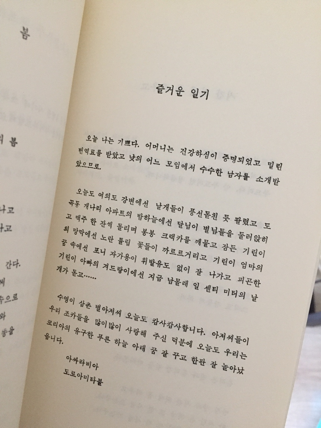 1984년, 내가 초등학생이 아닌 국민학생일 때 한 시인은 시집을 엮어냈다. 『즐거운 일기』2008년 초판 23쇄로 발행된 시집은 초판 발행 때의 글자체 그대로였다. 다시 10년이 지나서 보니, 낯익지만 오랜만인 글자체가 시어보다 먼저 눈에 띈다. 그렇다고 가독성이 떨어지는 건 아니다. 아니, 시를 가독성으로 읽는 사람이 어디 있겠나.