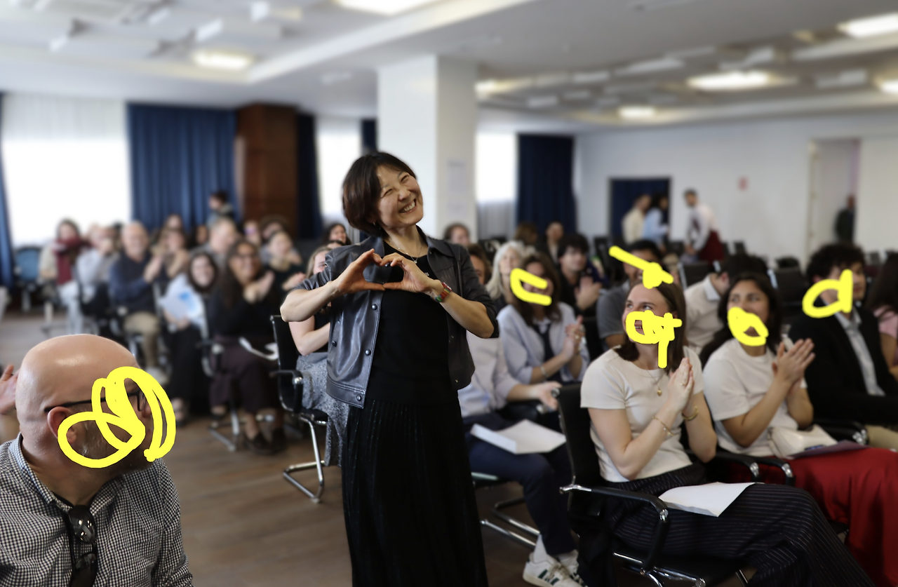 모두 환호를 보내며 서로를 축하해주었다. 축구에서 골을 넣고 세레모니를 하는 것처럼, 자원봉사자들도 저마다 단상 앞으로 나가며 자신만의 세레모니를 하기도 한다. 나는 한국인의 하트를 뿅뿅 날리며 앞으로 걸어나간다 (사진 참조 - 좀 예쁘게 나옴 ㅎㅎ ).