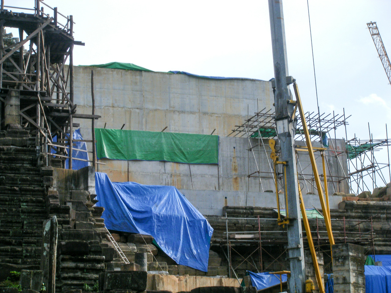 하지만 규모가 크다 보니 진도가 쉽게 나지 않았다. 또한 급한 경사로 인해 두 차례나 붕괴사고가 발생했다. 잇달은 복원의 어려움 속에 정치적 불안이 더해져 결국 공사는 중단되었다.