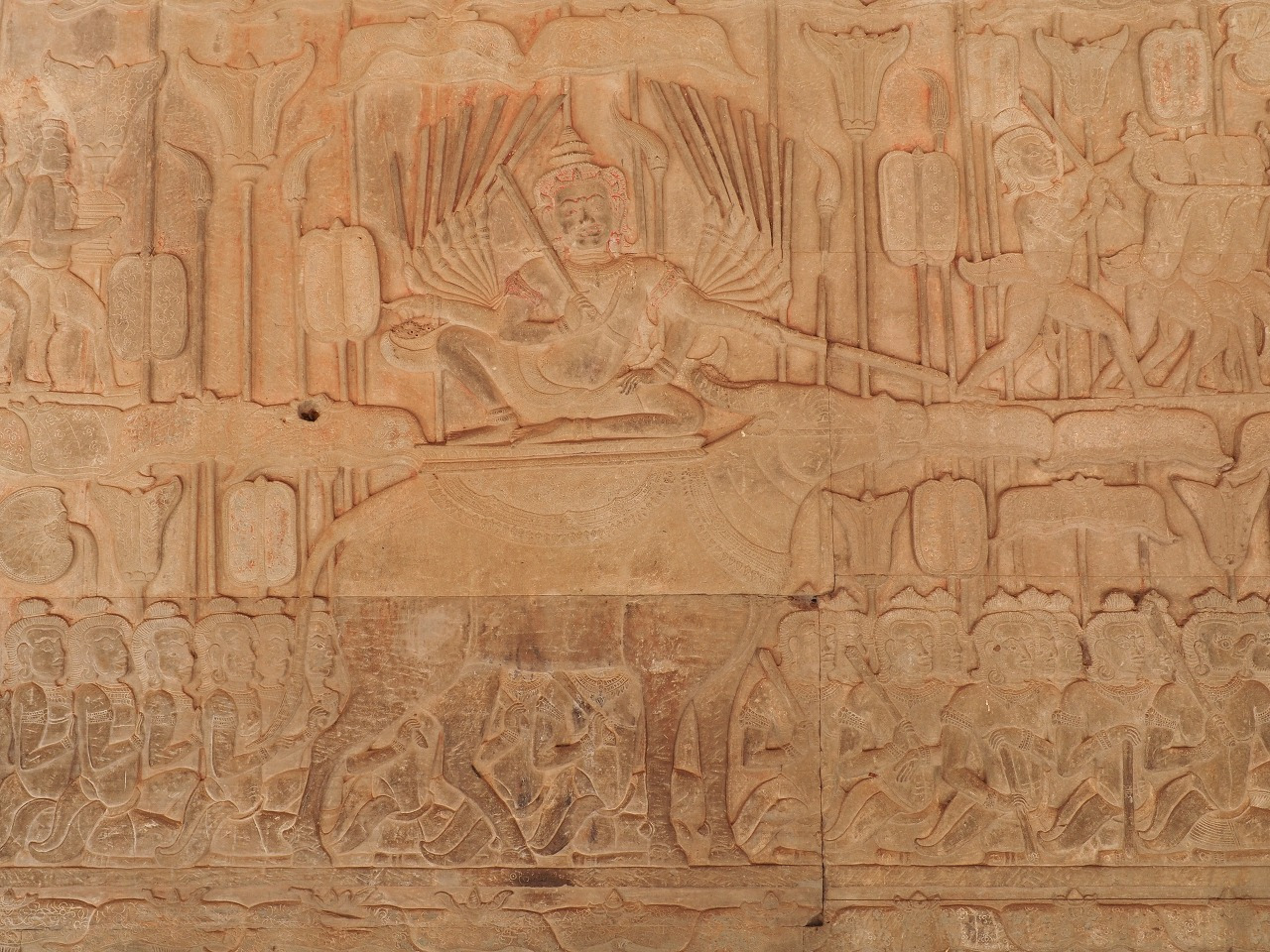 고대 크메르인들이 물소를 어떻게 생각했을까? 앙코르 왓의 부조 벽화를 통해 힌트를 얻을 수 있다. 앙코르 왓 부조 벽화 회랑의 남측 동편에는 천국과 지옥의 모습을 그린 부조 벽화가 있다. 60미터에 이르는 벽화는 왼쪽에서 오른쪽으로 이어지는데, 왼쪽에는 사후세계로 가는 사자들, 그리고 오른쪽에는 37개의 천국과 32개의 지옥의 모습이 그려져 있다. 이 대형 벽화의 중앙에는 사후세계의 신이자 사자들의 심판관인 '야마(Yama)'가 그려져 있다. 야마는 사자들의 생을 꿰뚫어보고 평가를 하기에 저 세상에서는 절대적인 존재이다. 앙코르 왓의 조각가는 벽면에 물소를 타고 있는 야마의 모습을 근엄하면서도 위압감이 잘 드러나도록 표현했다.