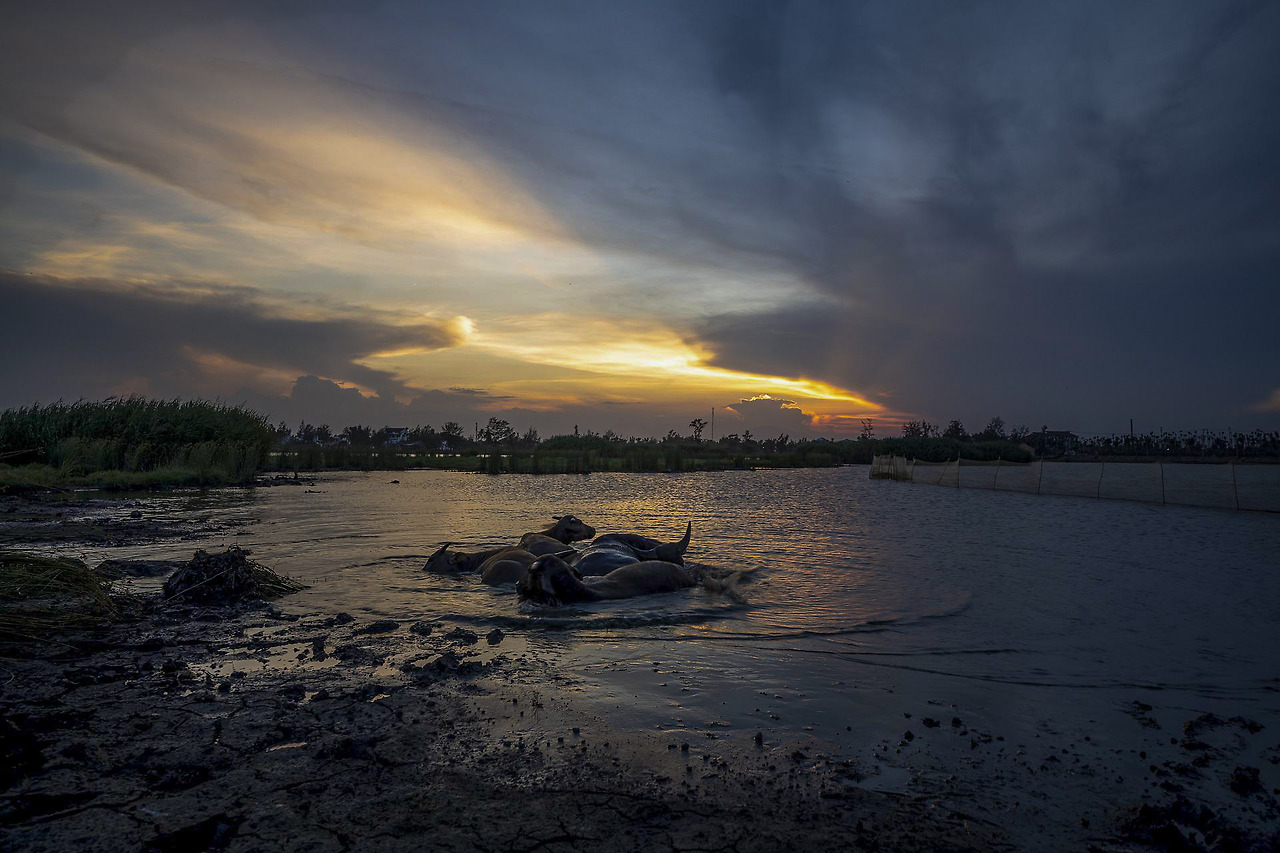 땅거미가 지는 검은 강물 속으로 물소가 유유히 걸어 들어간다. 캄보디아에서 해질 무렵에 흔히 볼 수 있는 풍경이다. 소들은 해가 지면 부지런하게 집으로 돌아가기 바쁘지만, 물소들은 항상 더 늦게까지 머문다. 자신들의 시간을 조금 더 즐기려는 듯하다.