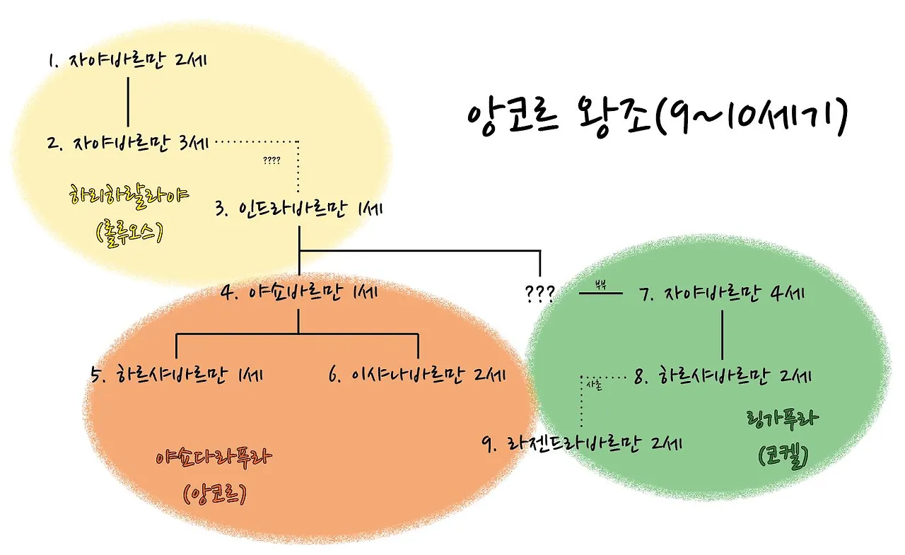 9~10세기 앙코르 왕조 왕위 계승관계 및 통치 거점
