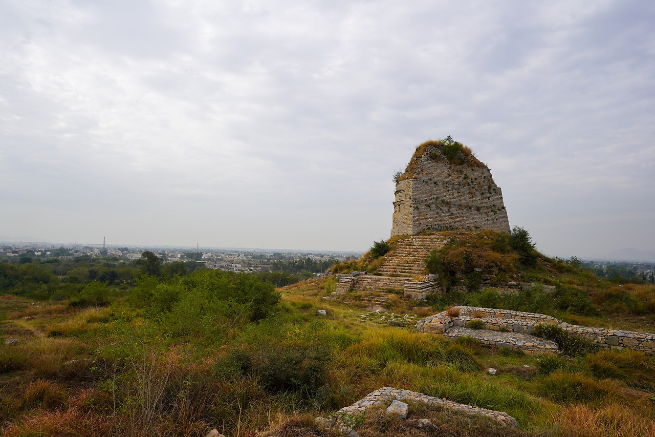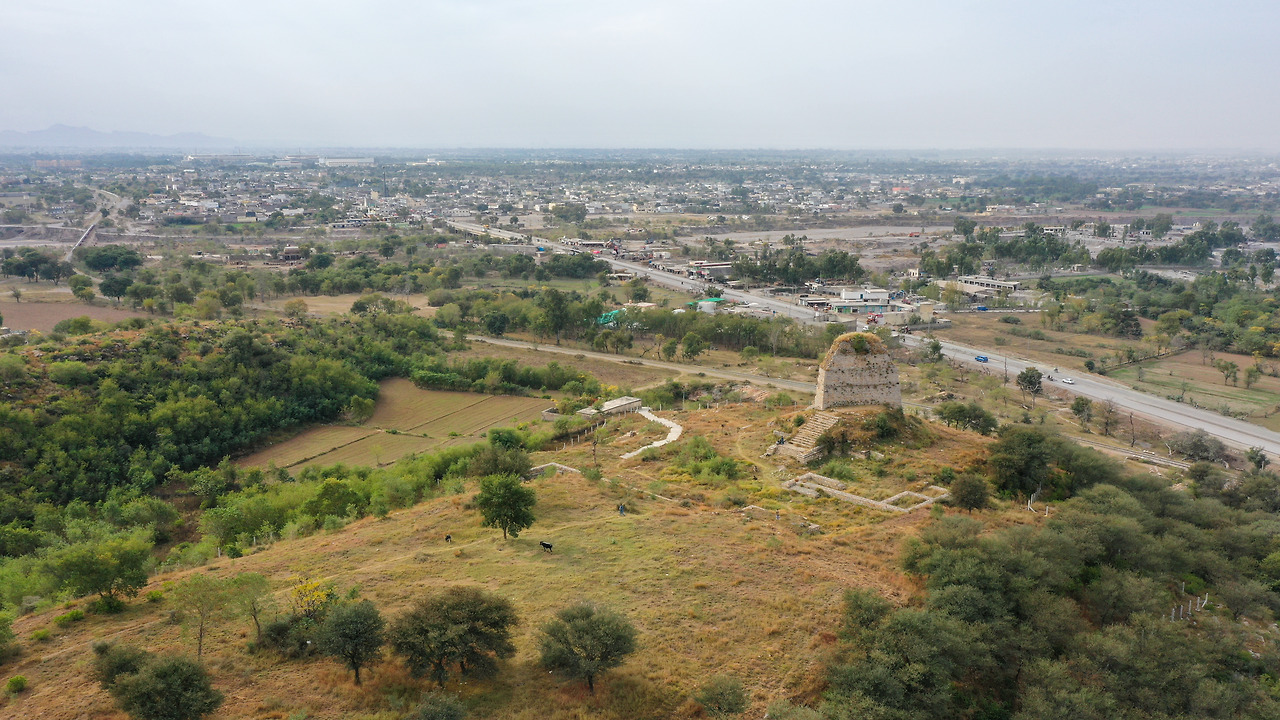 탁실라로 들어오는 관문과도 같은 발랄톱 스투파, 옆으로 난 길은 고대에도 사용되었다.