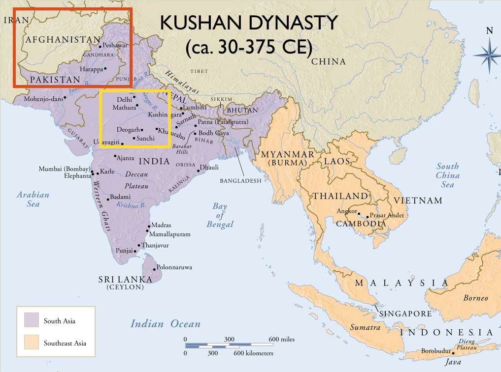 간다라(빨강)와 마투라(노랑) 위치(출처: www.sutori.com)