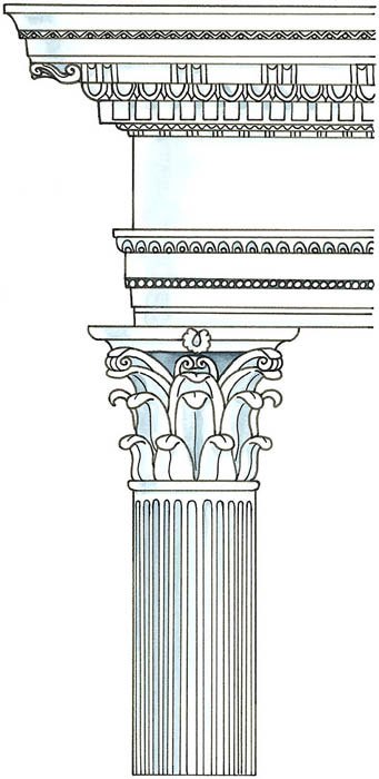 (좌) 쌍두취탑에 조각된 사원들, (우) 코린트 양식 기둥 조각