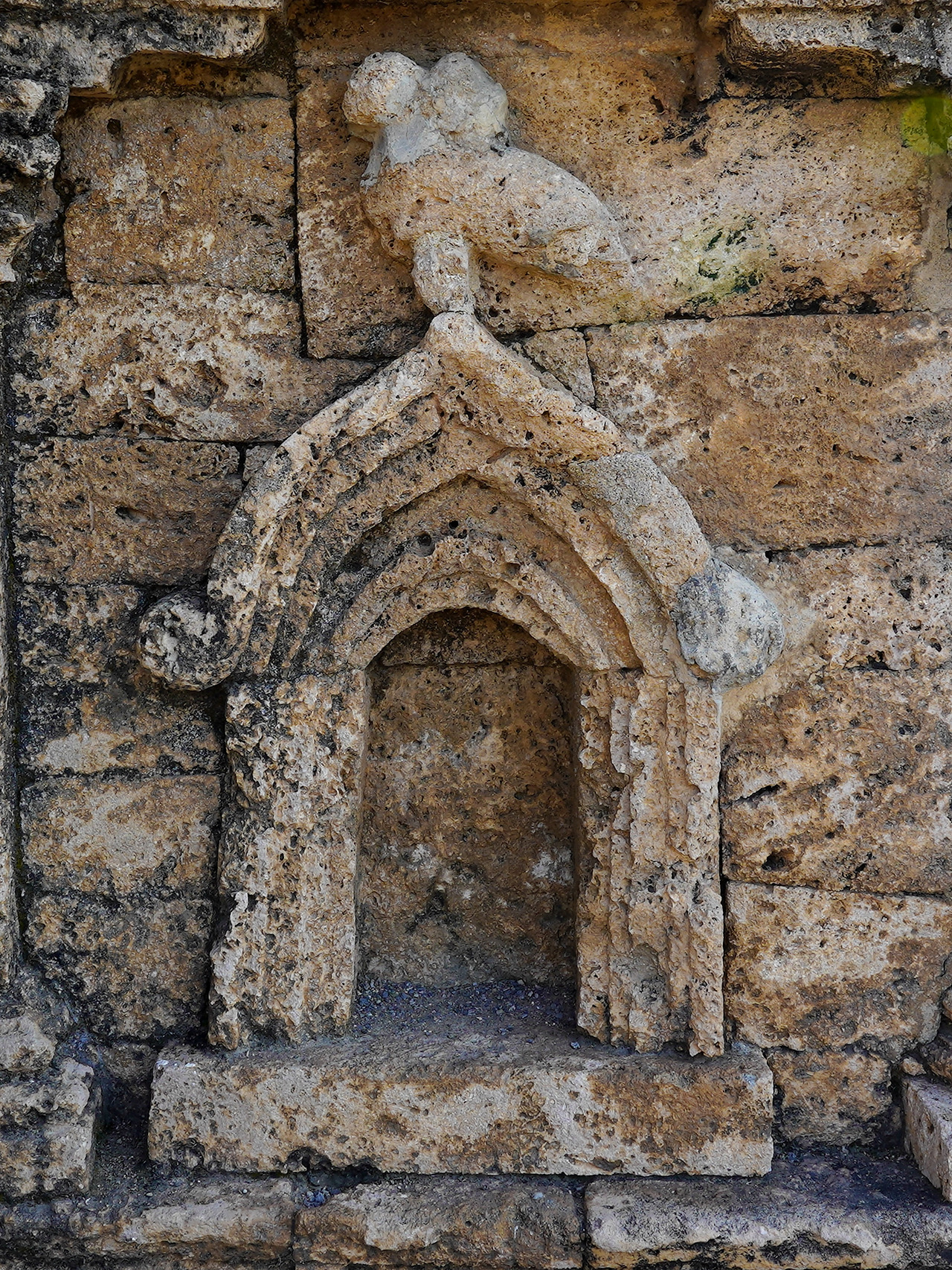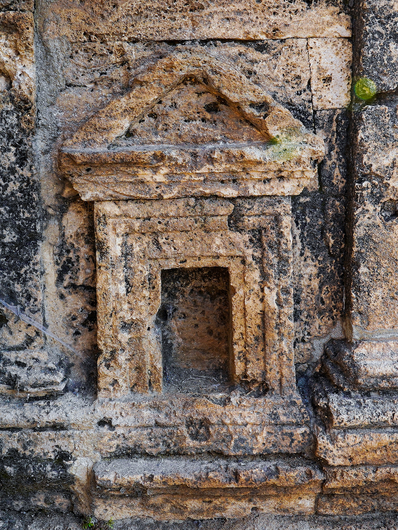또한 부조 벽화에 조각된 사원 중 하나에는 삼각형의 페디먼트가 명확하게 표현되어 있다. 이는 전형적인 그리스 신전 건축의 유형이다. 그 외에 두 종류의 건축이 보이는데, 이는 인도 지역에서 흔히 보이는 형태의 사원 건축이다.