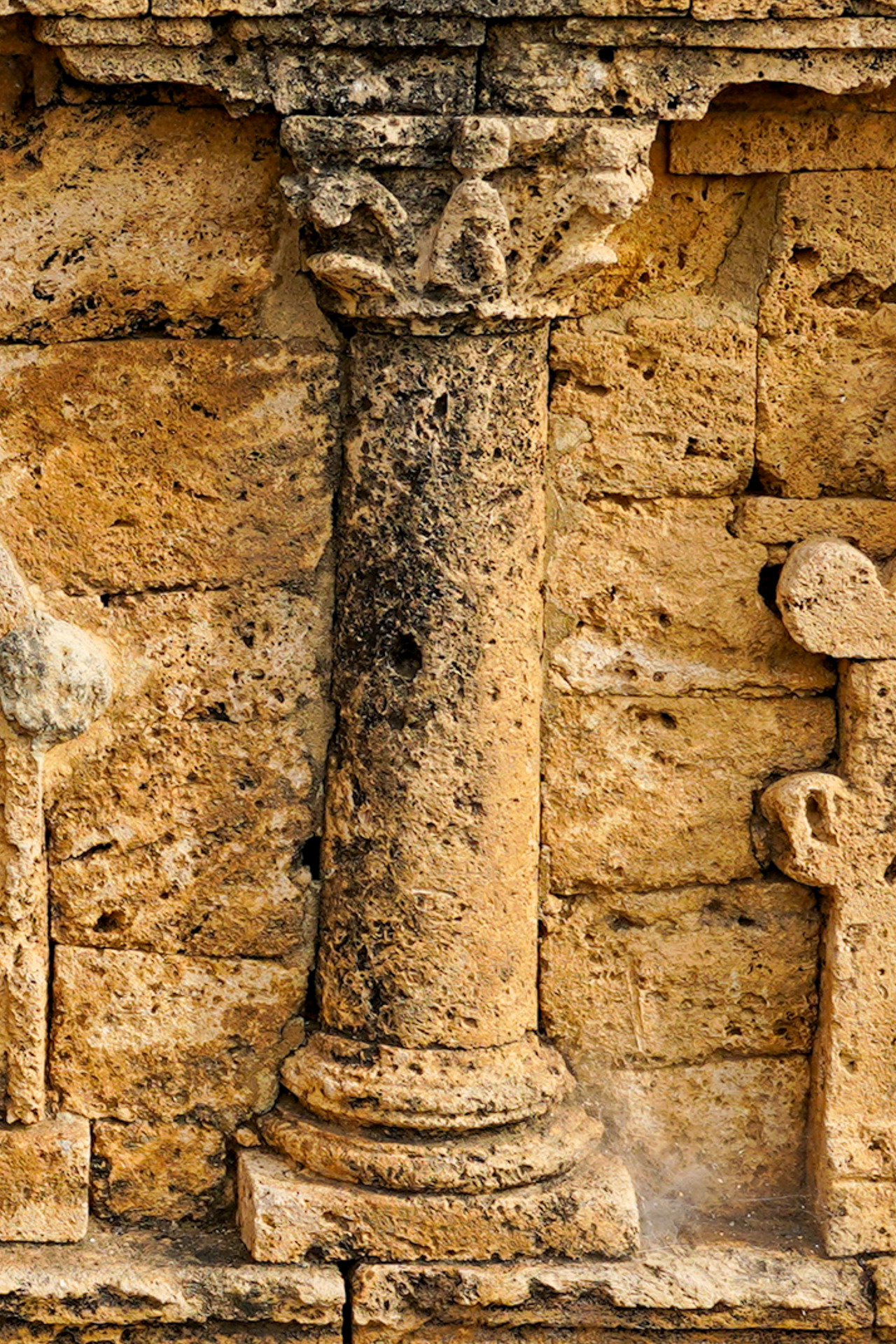 부조 조각에는 그리스에서 건너온 건축기술이 명확하게 표현되어 있다. 기단 측면을 구획하는 기둥형 조각에 그리스의 대표적 건축양식인 코린트(Corinthian) 양식 주두가 확인된다. 코린트식 주두는 앞서 설명한 이오니아 양식과 함께 그리스 사원건축을 대표하는 건축 양식이다.