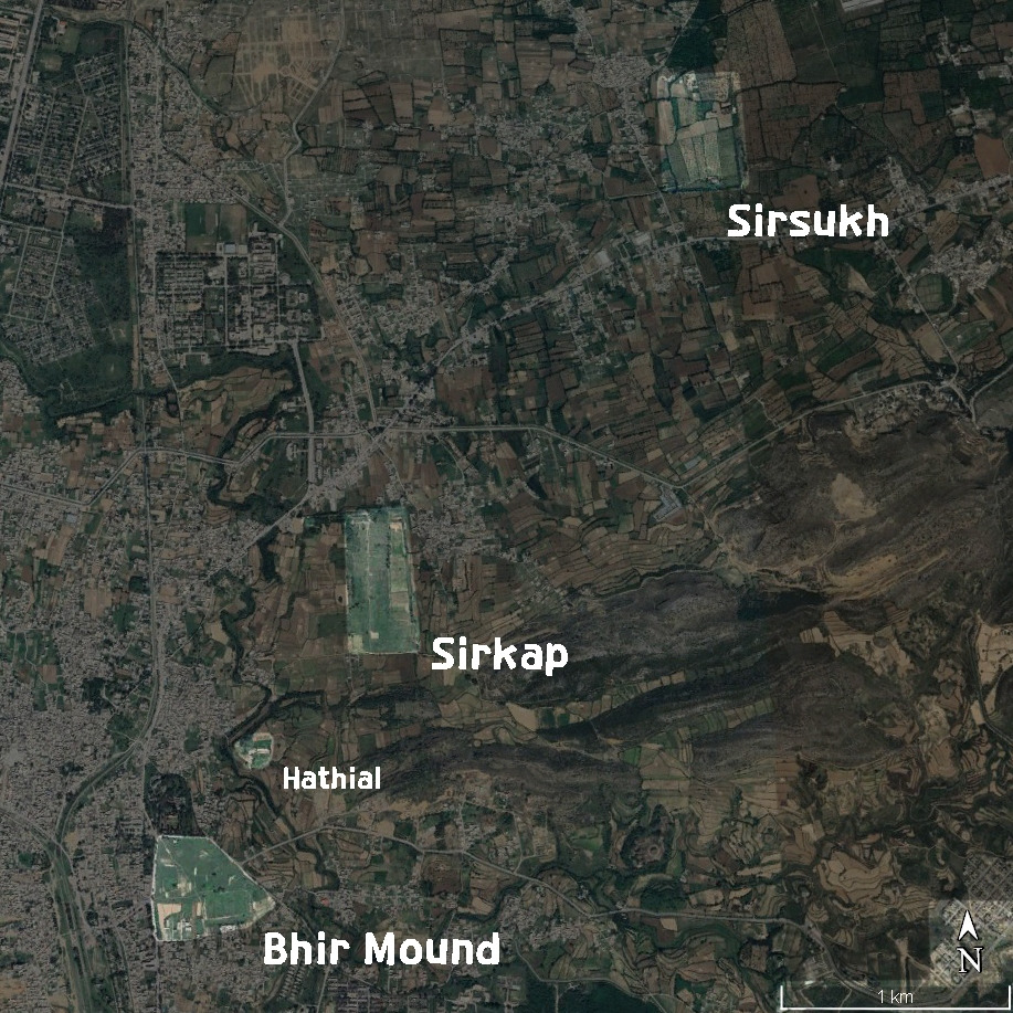 (좌) 탁실라의 고대 도시들의 위치, (우) 비르마운드 유적