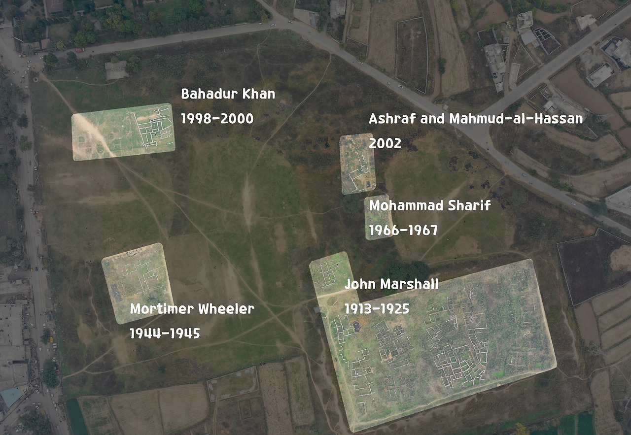 첫 발굴조사는 지금으로부터 1세기 이전인 영국 식민지 시대로 거슬러 올라간다. 인도고고학연구소(ASI)의 존 마셜(John Marshall)은 1913년부터 1925년까지 비르마운드 발굴을 추진하였다. 가장 오랜 시기에 걸쳐 진행된 만큼 발굴 대상지도 가장 넓다. 현재의 유적지 남동쪽으로 넓게 노출된 유구들이 그에 의해 발굴된 지역이다. 그 이후로는 단발적 형태의 발굴조사가 이어졌다. 1944년부터 1945년까지 모르티머 휠러(Mortimer Wheeler)에 의해서 서쪽일대가, 1966년부터 1967년까지 모하마드 샤리프(Mohammad Sharif) 박사에 의해서 동쪽의 일부, 1998년부터 2000년까지 바하두르 칸(Bahadur Khan)에 의해서 북서쪽 일대가, 마지막으로 2002년에 아쉬라프(Ashraf) 박사와 마뭇 울 하싼(Mahmud-al-Hassan) 박사에 의해서 북동쪽 일대의 발굴이 진행되었다.
