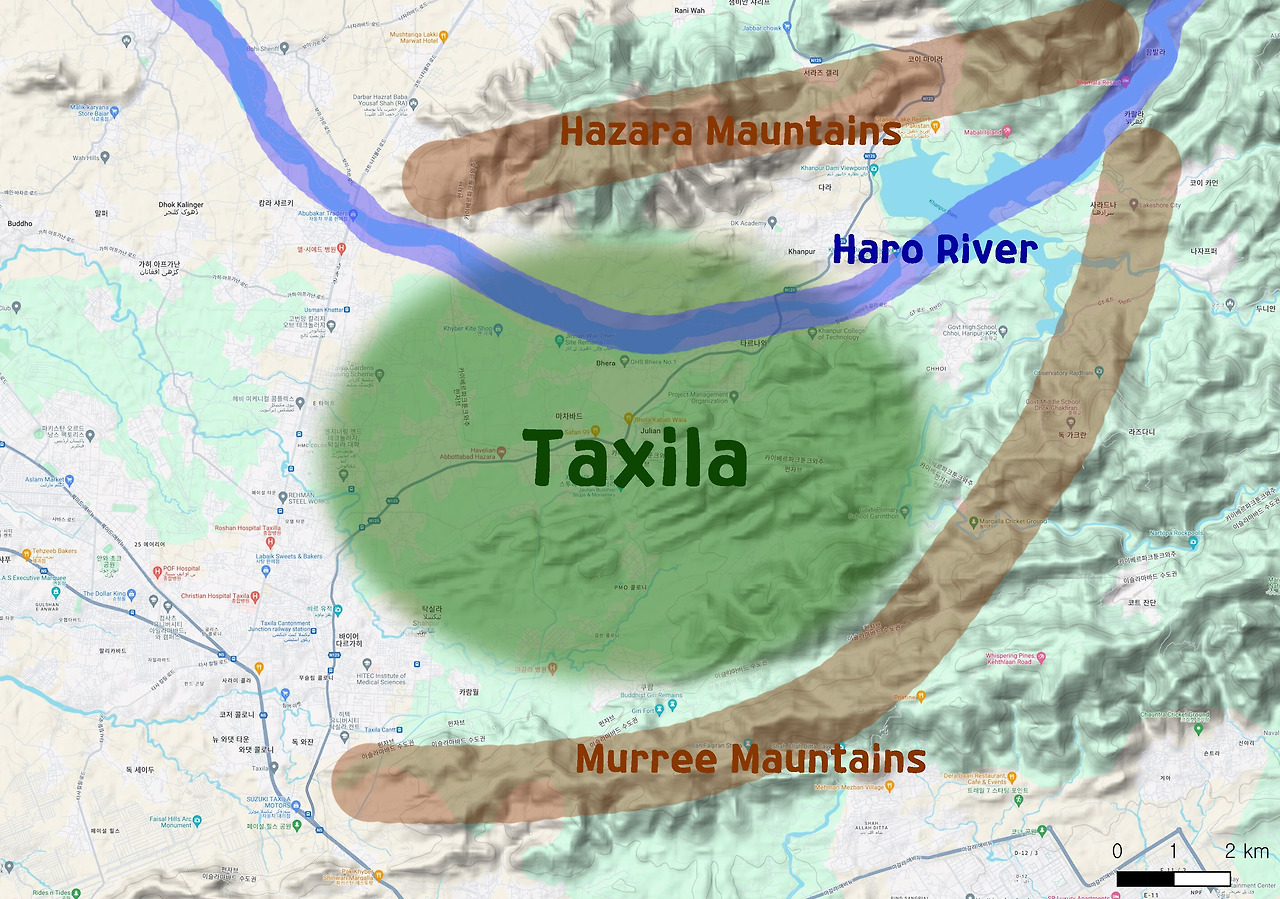 고대도시 탁실라의 입지, 북으로 하자라 산맥, 남쪽과 동쪽으로는 머리산맥으로 둘러싸여 있고, 하로강이 동서로 가로지른다.