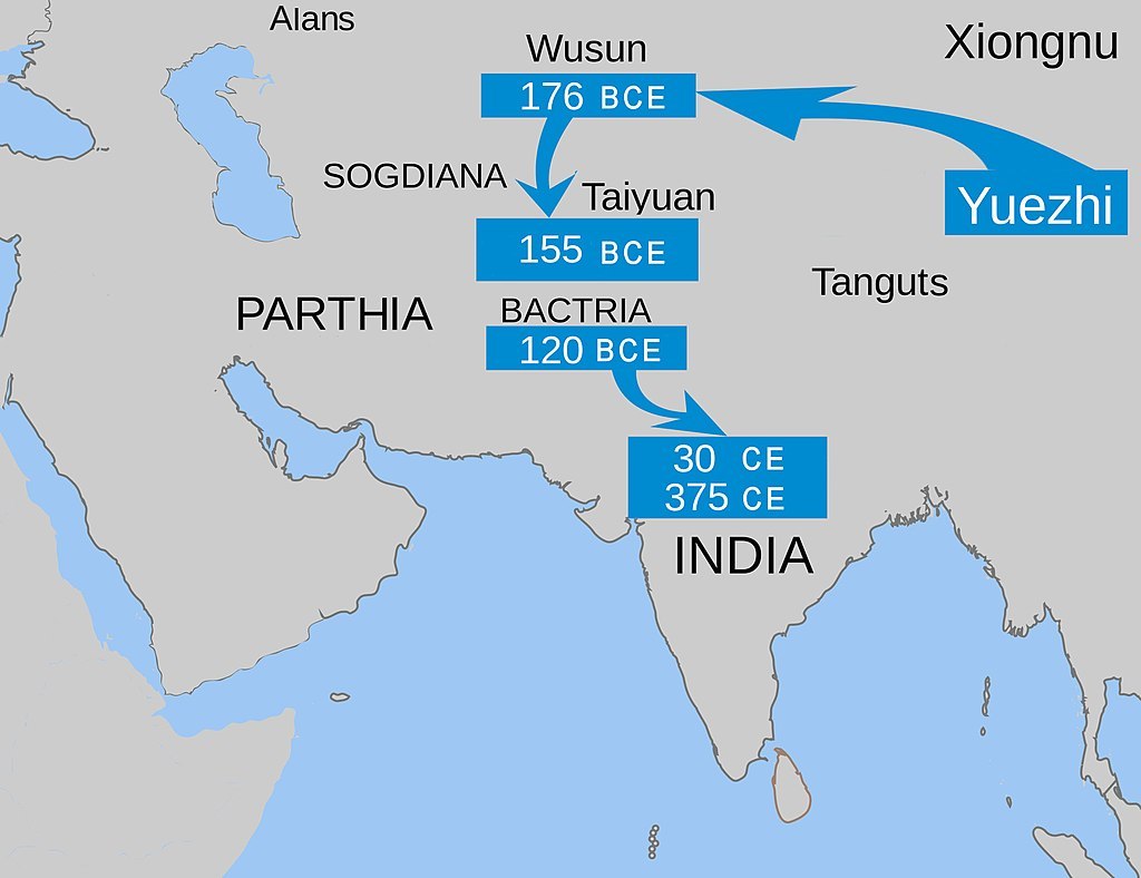 쿠샨의 뿌리는 중국 북쪽에서 거주하던 '월지(月氏, Yuezhi)'에 있다. 월지는 기원전 3~2세기 경 중국의 북서쪽인 둔황과 기련지역을 근거지로 유목생활을 했다. 하지만 흉노의 급성장으로 월지의 대부분은 근거지를 버리고 서쪽의 일리강 유역으로 터전을 옮겼다. 하지만 또다시 오손(烏孫, Wusun)의 공격을 받아, 더욱 서쪽으로 옮겼다. 이번에는 중앙아시아인 소그디아나와 박트리아 일대에 다시 터전을 마련했다. 불과 반세기 만에 외세의 공격에 두 번이나 근거지를 옮긴 것이다. 이후 월지를 구성하던 다섯 부족 중 쿠샨족이 권력을 잡았고, 국명을 '쿠샨'이라 칭하였다.