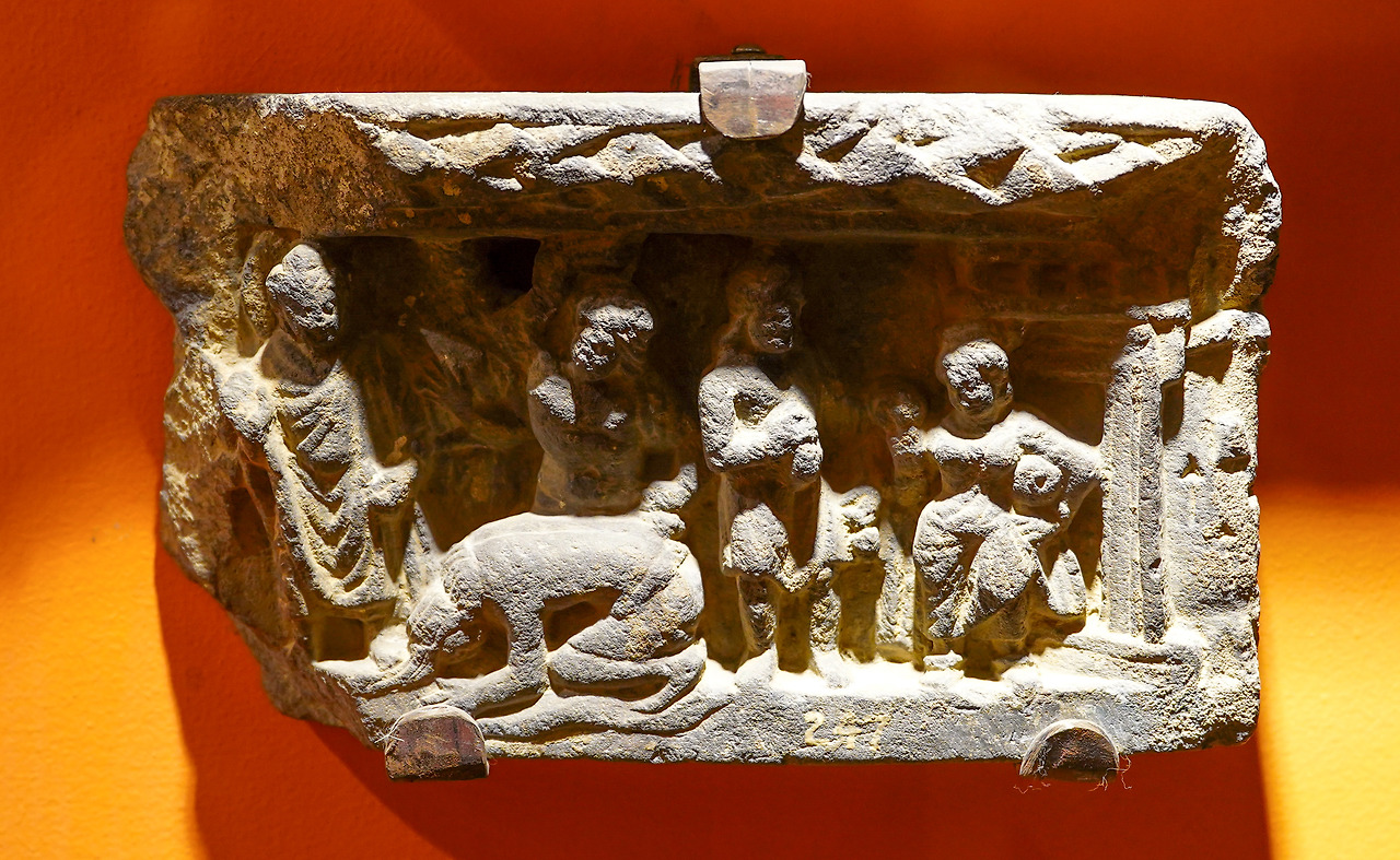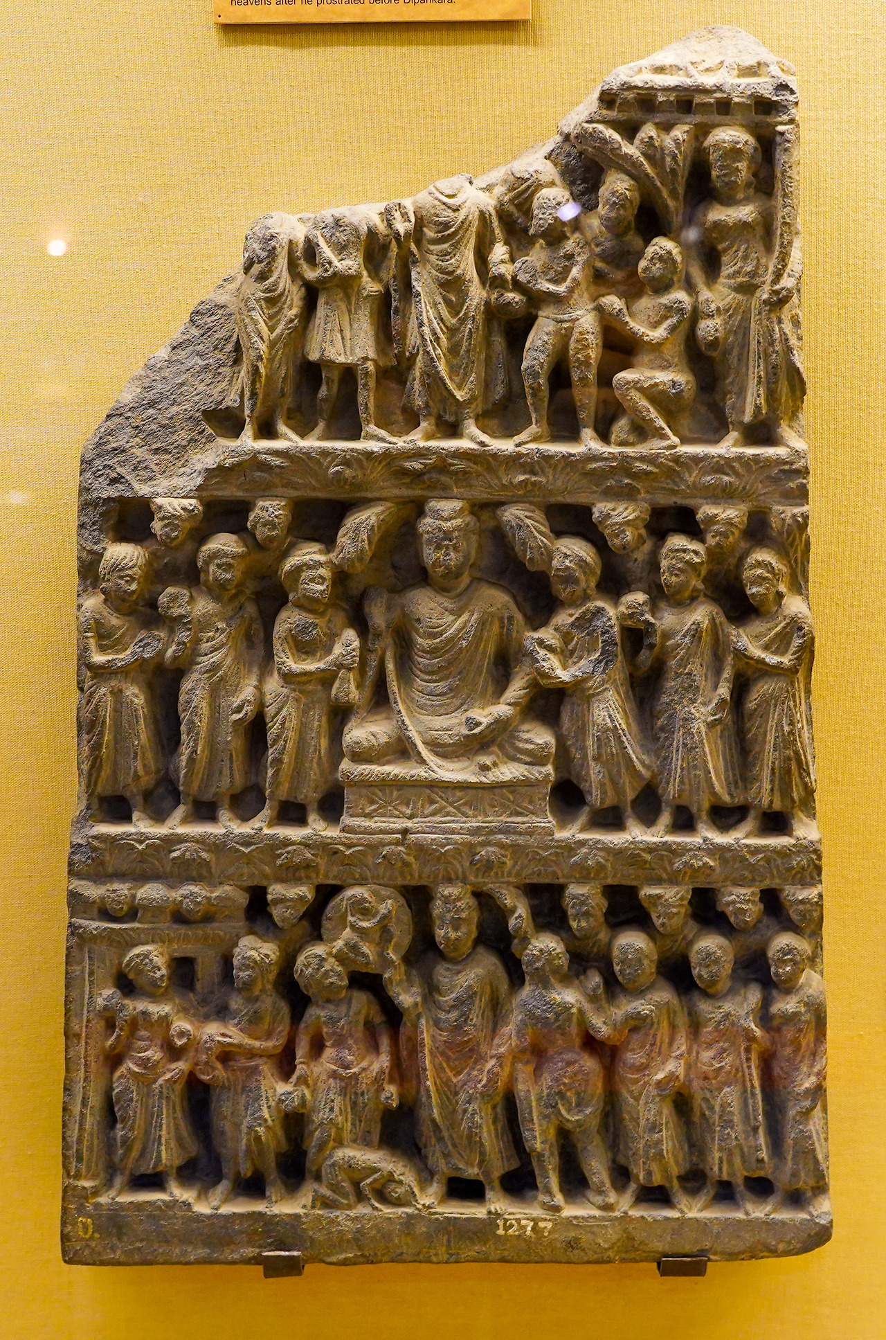 시르키 출토 스투파와 첫 번째로 조각되어 있는 디판칼라 자타카(라호르 박물관)