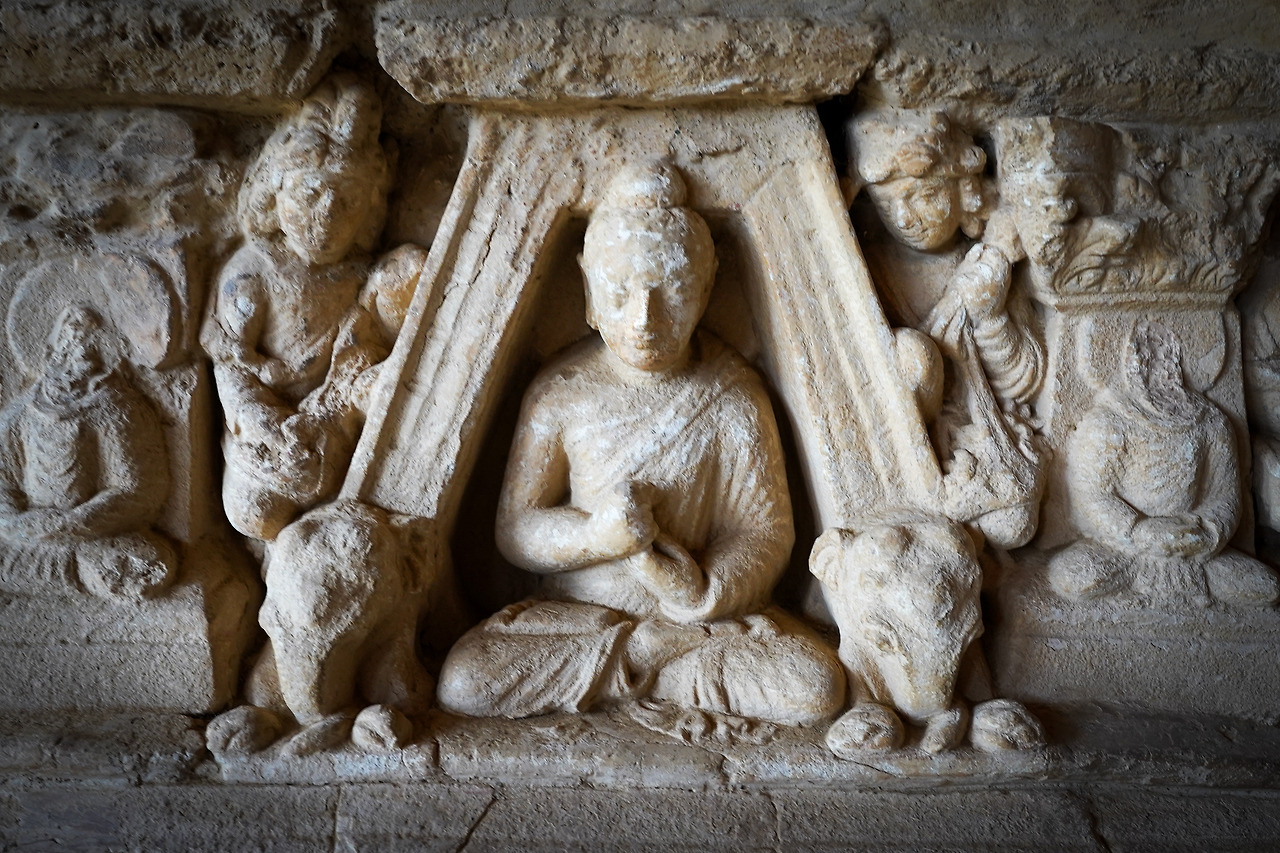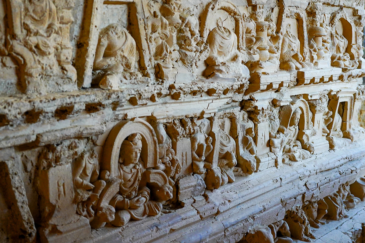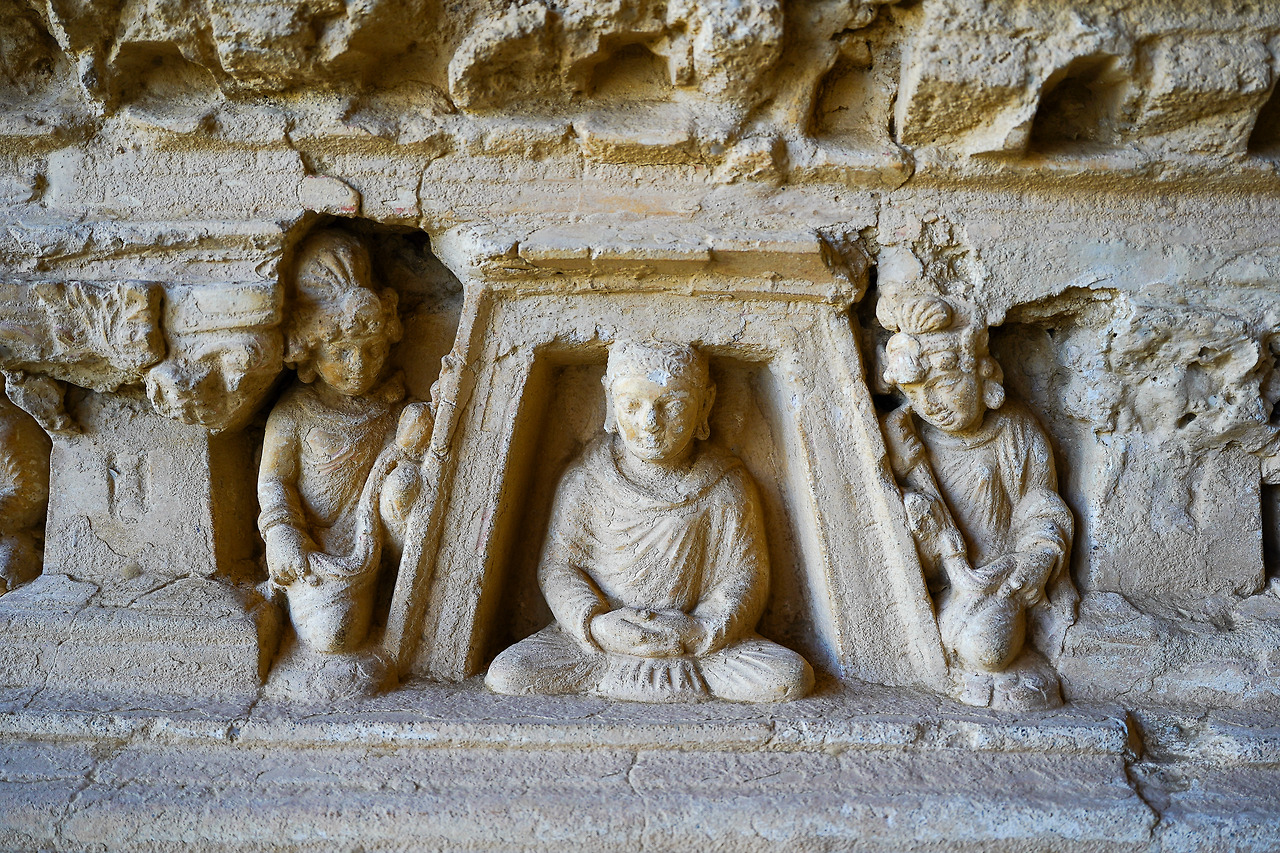 가장 먼저 눈에 들어오는 것은 부처상들이다. 부처상들은 반복되어 나열되어 있는 사다리꼴 혹은 나뭇잎형 벽함 속에 하나씩 조각되어 있다. (사다리꼴 벽함을 그리스형, 나뭇잎형 벽함을 남아시아형이라 부른다.) 부처상들은 모두 좌상으로 조각되어 있으며, 간다라에서 유행한 설법인, 선정인을 하고 있는 경우가 대부분이다. 이곳의 회반죽 조각이 아름다운 것은 작고 섬세한 것도 있지만 특히 주목할 만한 부분은 자연스러운 얼굴 윤곽이다. 조그마한 조각임에도 굴곡이 섬세하게 다듬어져 마치 진짜 사람의 살깥처럼 부드러울 것 같아 보인다.