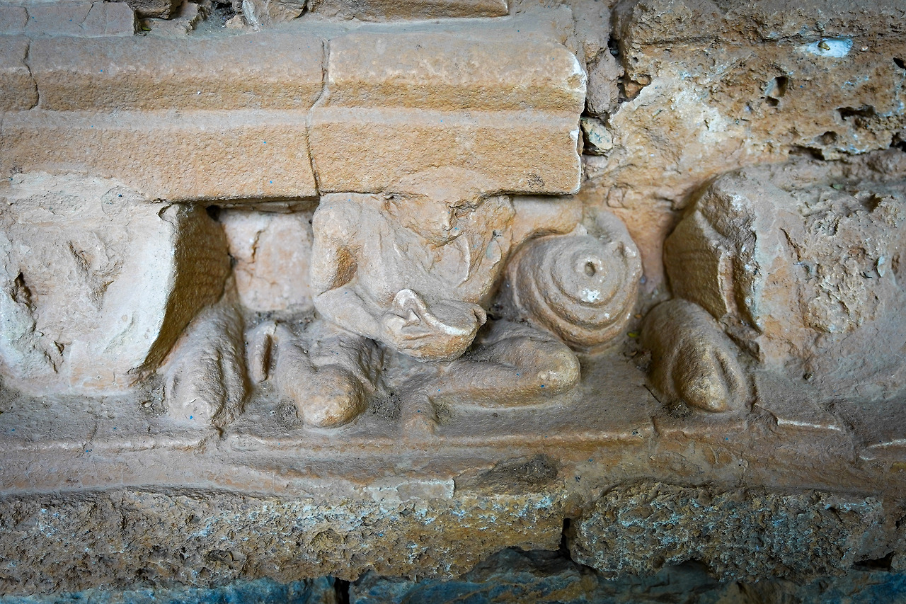 또 한편으로 흥미로운 부분은 봉헌 스투파 하부에 나열되어 있는 야차들이다. 아틀라스 편에서 설명했던 것과 같이 야차들은 신성한 부처님의 건물을 더러운 땅으로부터 들어 올리는 역할을 한다. 대부분은 힘들고 고통스러워 보이지만 술을 마시는 형상으로 묘사되어 있는 사례도 있어 보는 재미를 더한다. 그리고 건물을 들어 올리는 역할은 야차뿐만 아니라 동물들도 보인다. 사자와 코끼리로 보인다.
