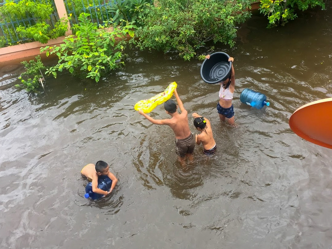 비로 잠긴 마당에서 물놀이하는 아이들(라오스) ⓒ 박동희