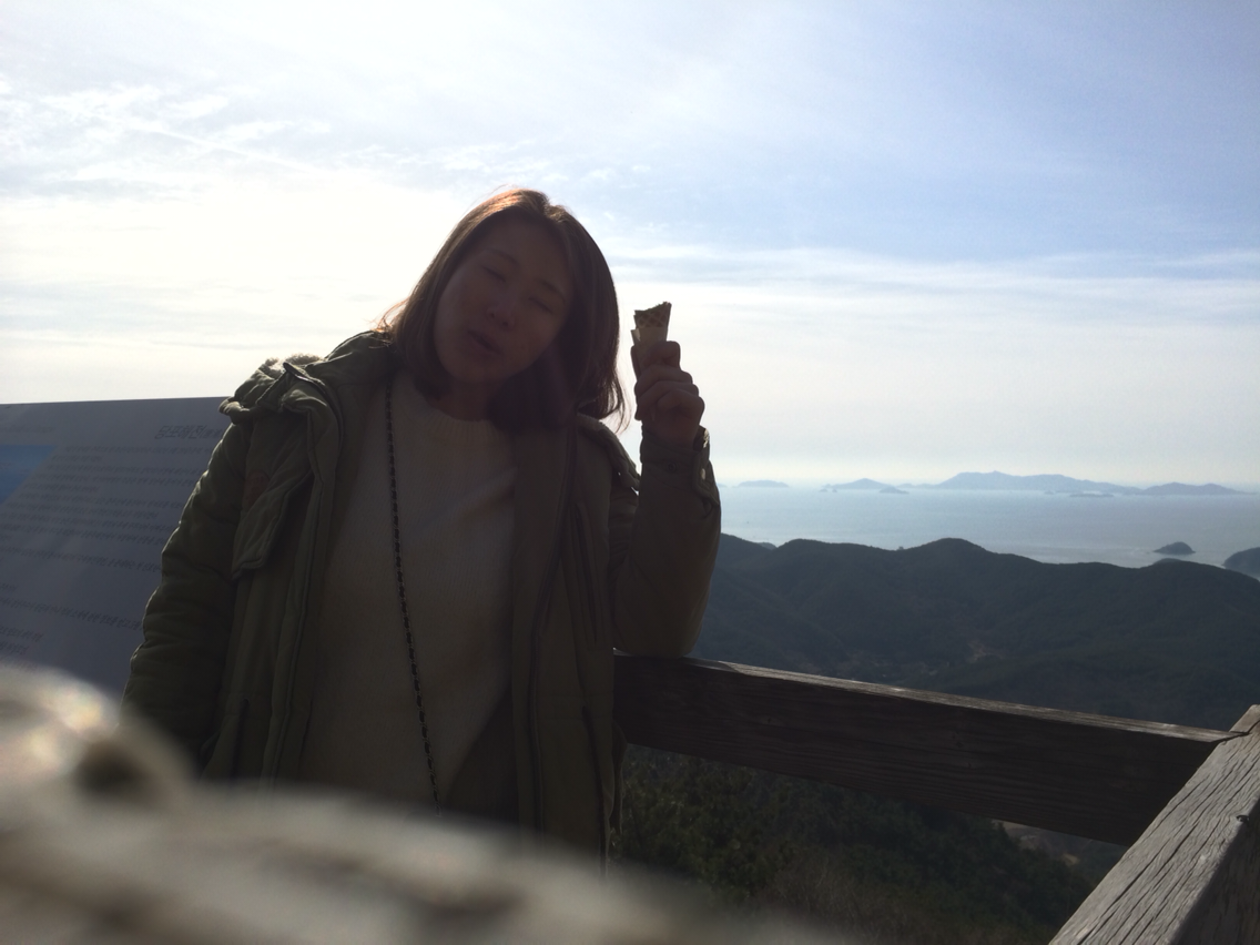 정상이다.. 케이블카로 인해 방문객이 많으니 이를 수용하기 위해 정상 바위를 나무테라스로 뒤덮었다.. 다행히 바위를 깨트려가며 작업한 것은 아닌 것 같지만, 상당한 아쉬움이 남았다.. 어릴때 여러번 미륵산을 올라와본 하얀이는 상당히 실망한 눈치였다..