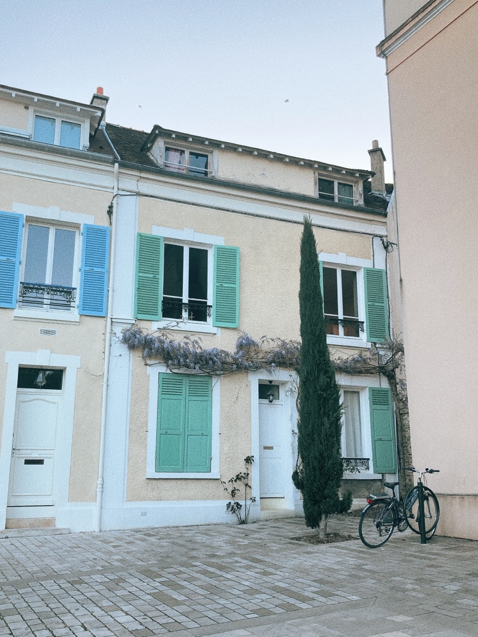 산책 코스의 중간 지점인 마을 성당 앞 후미진 골목에 자리하고 있는 집 대문 위로 마치 크리스마스트리 장식처럼 등나무가 걸려있네요. 자전거가 세워진 자리 바로 옆에는 유럽에서 흔히 볼 수 있는 실편백 한 그루가 하늘 높은 줄 모르고 서있어요.