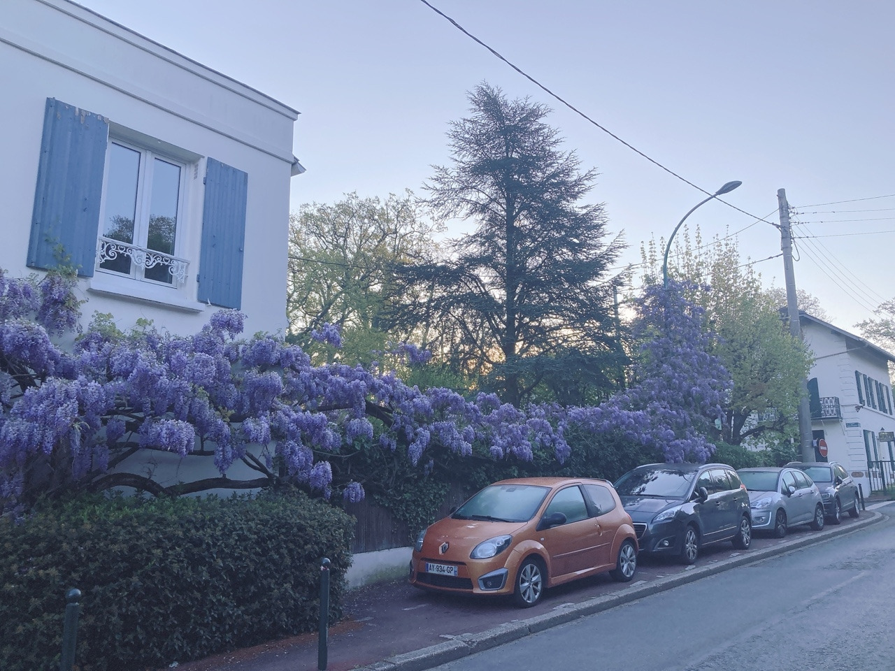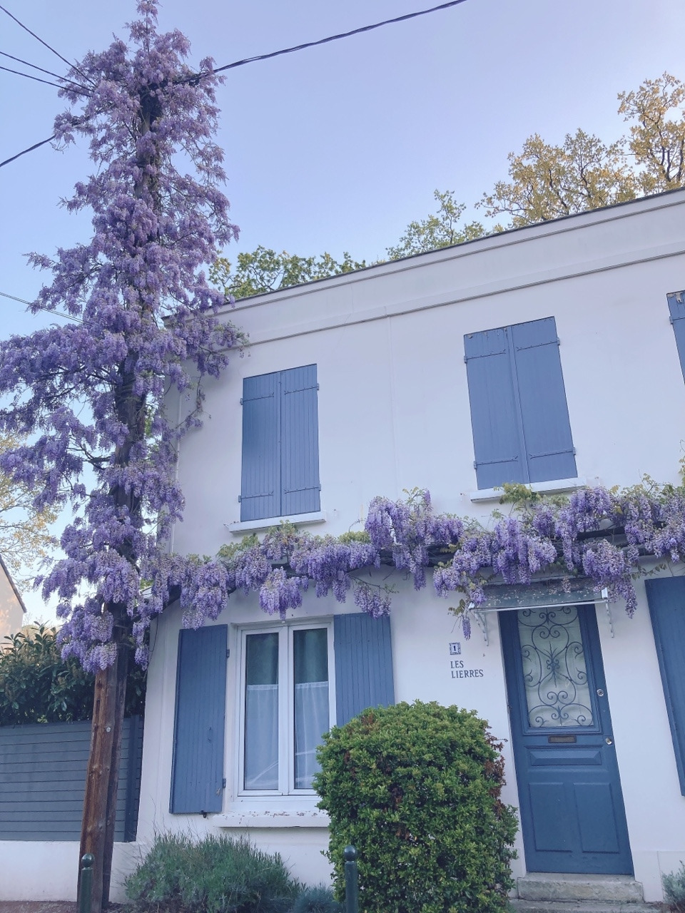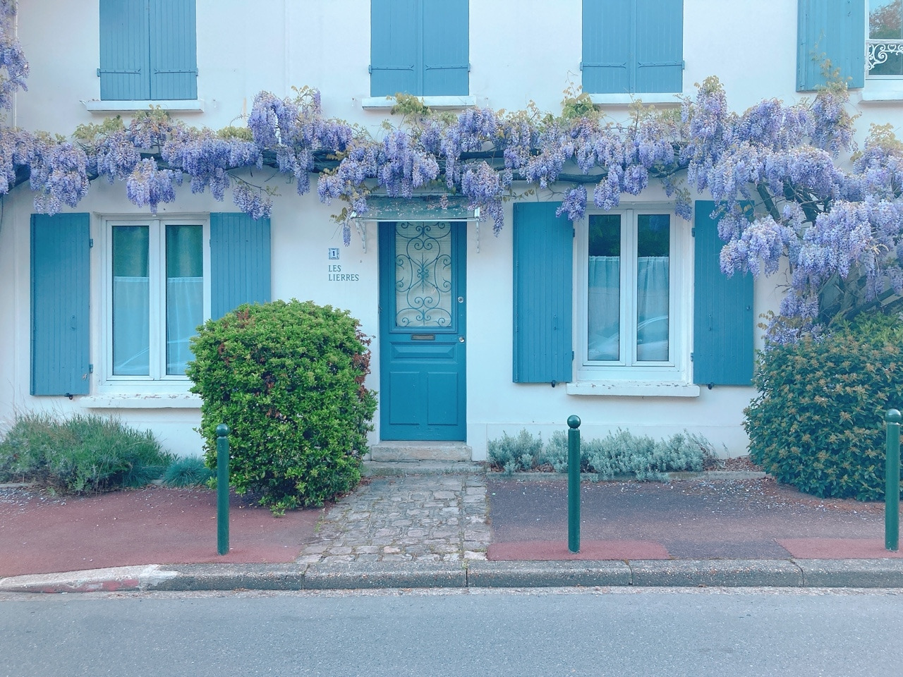 오늘 아침 산책 코스에서 만나는 등나무 꽃의 하이라이트는 바로 여기가 아닐까 해요. 소박하고 조촐한 집 현관 위로 등나무 덩굴이 리스 모양으로 뻗어나가 마치 왕관처럼 씌워져 있어요. 프랑스에서는 보통 집 대문이나 담벼락에 애칭이나 별칭을 표시해 두는데 이 집의 애칭은 담쟁이덩굴(Les Lierres)이라 적혀있네요.