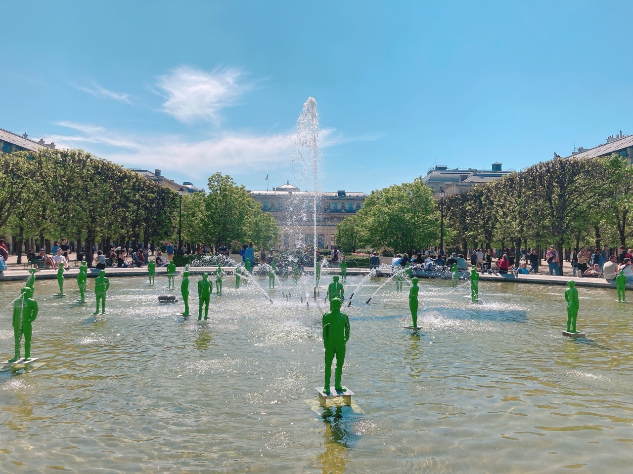 그 손바닥 만한 정원에도 분수대가 있고 나는 시원하게 솟구치는 분수를 보며 청량한 마음을 구해본다. 분수대에 세워져 있는 초록 인간이 낯설게 귀엽다. 지난겨울에 들렀을 때 분명히 없었던 것 같아 검색해보니 프랑스 설치 예술가 Fabrice Hyber의 Hommes de Bessines이라는 설치작품이다. 작가 자신 키 절반 정도에 해당하는 87cm 높이의 초록 인간 30점을 작가 인생 30주년을 기념하여 지난 4월 5일부터 오는 5월 31일까지 특별 전시 중이다. 초록 인간은 오늘을 살아가며 내일로 나아가야 하는 인간의 자연으로의 회귀와 부유함을 상징한다고 한다.