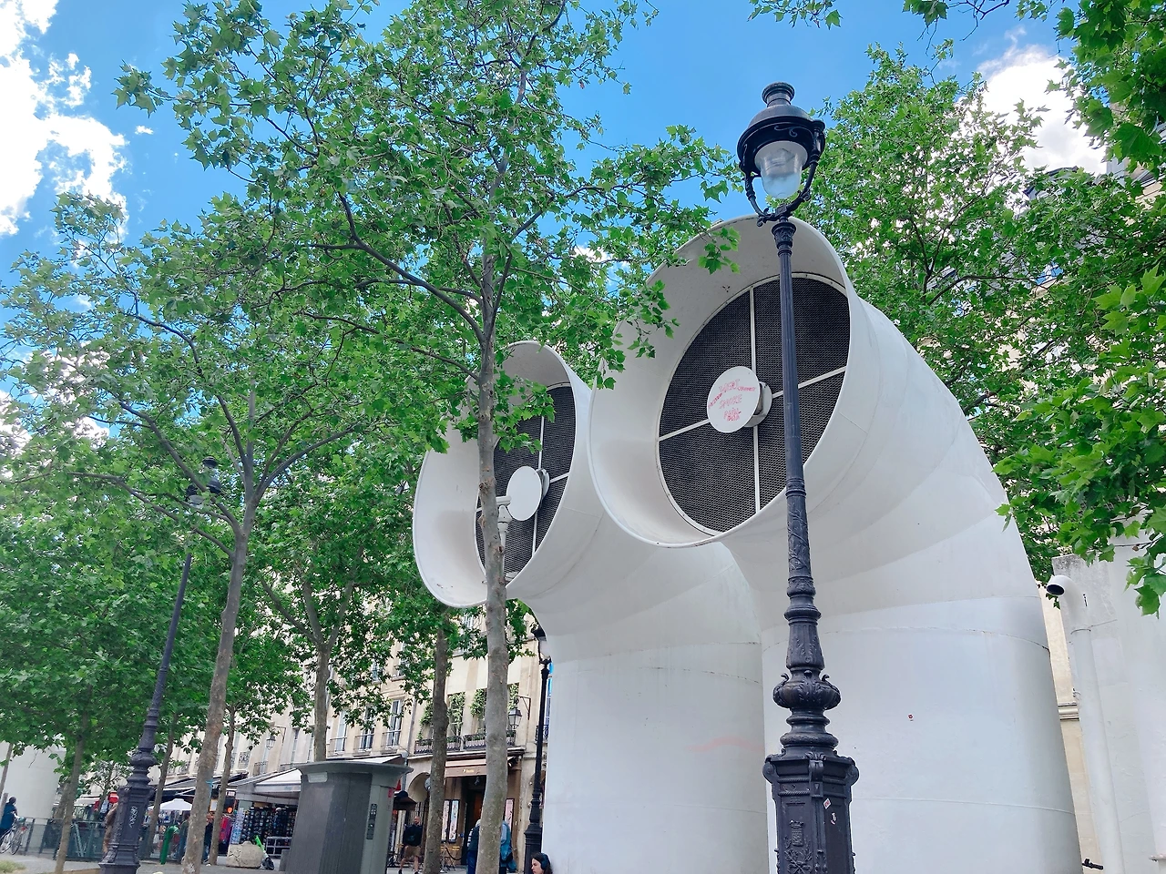 퐁피두센터를 마주 보며 서있는 거대한 환기구가 이색적인 풍경을 연출한다. 두 개가 쌍을 이루어 서있는 모습이 미래도시의 감시자처럼 보여 순간 가슴이 서늘했다가 또 어찌 보니 영화 E.T. 에 나오는 귀여운 E.T. 눈 같아 보여 피식 웃음이 나기도 한다. 다양한 해석이 가능한 현대 예술을 다루는 퐁피두센터 광장과 묘하게 어우러진다.