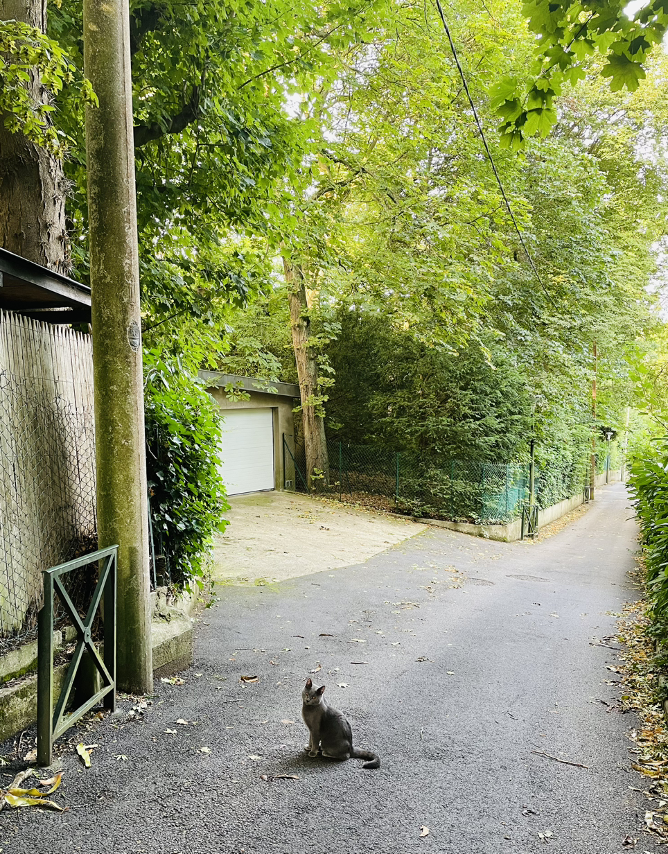 다음날도 어김없이 평소와 같은 시간에 눈을 뜨고 또 비슷한 시간에 아침 산책을 나섰다. 대체로 여름에 고온 건조한 프랑스 날씨가 올여름에는 이상기후 탓인지 저온다습 현상이 심각했다. 7월 중순부터 2주 연속 20도 이하 온도에 장마 같은 비가 계속 내리는 통에 살짝 우울감이 느껴질 정도였다. 그나마 아침 루틴으로 자리 잡은 아침 산책 덕분에 하루를 상쾌하게 시작한다. 그날도 아침 산책 코스 마지막 지점인 살짝 가파른 언덕길을 오르는 중이었다. 조용한 골목길을 으쌰으쌰 정신없이 오르는데 뭔가 모를 존재감이 시야를 흐리게 한다. 앗, 골목길 끝자락 주택가 앞에 회색빛깔 고양이가 나를 가만히 쳐다보고 있는 것이 아닌가. 부리나케 주머니에서 핸드폰을 꺼내 들고 클릭을 하는 그 순간까지도 냥이는 그 자리에 가만히 서서 물끄러미 나를 바라보고 있다. 고요한 아침 산책을 너와 마무리 할 수 있어 행복했어!